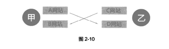 第一种是双方均拥有两个网站:甲方拥有A、B两个网站,乙方拥有C,D两个网站,则甲方用A站链接乙方的D站,乙方用C站链接甲方的B站(如图2-10所示)。