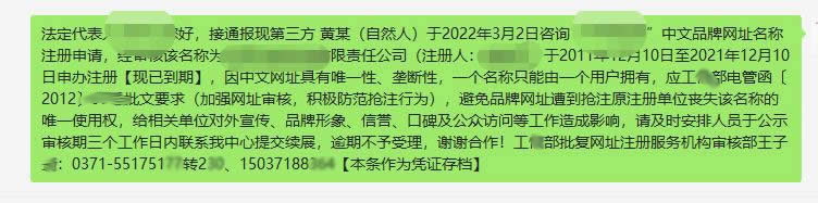 二、利用“中文域名遭抢注,优先保护注册”为名行骗。