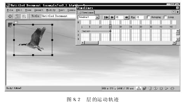 (1)在页面中添加一个新层,在层中插入图像ing8-2,gif,然后将层移动到动画的起始位置。