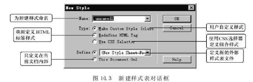 在图10.3所示"NewStyle"对话框中的“Name”选项中输入样式名称.my-css-1”。在"Define"选项组中选择"ThisDocumentOnly"单选项,单击"OK"按钮。