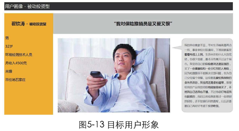有的产品经理和设计师还会把目标用户的特征抽象成具体的人物、制作成卡片,贴在自自己的办公桌上,时刻提醒自己,这才是我的目标用户,我做需求、设计决策时要围绕他来考虑。他的使用场景、使用目标是什么?我们希望他如何使用我们的产品,以实现我们的商业价值?如图5-13所示,这是一个虚拟的目标用户形象。