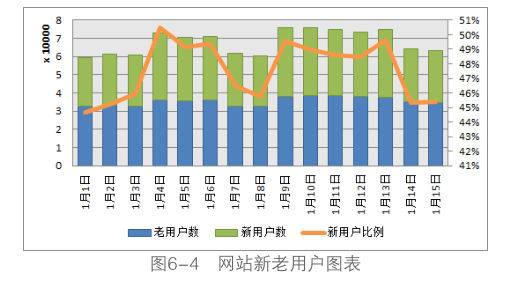 如图6-4所示,可以用柱状堆积图显示新用户和老用户的数量变化,堆积的结果就是网站总用户数量的变化,结合新用户比例的折线,通过分析网站新用户的数量和比例的变化能够直接反映网站在营销推广上的效果。