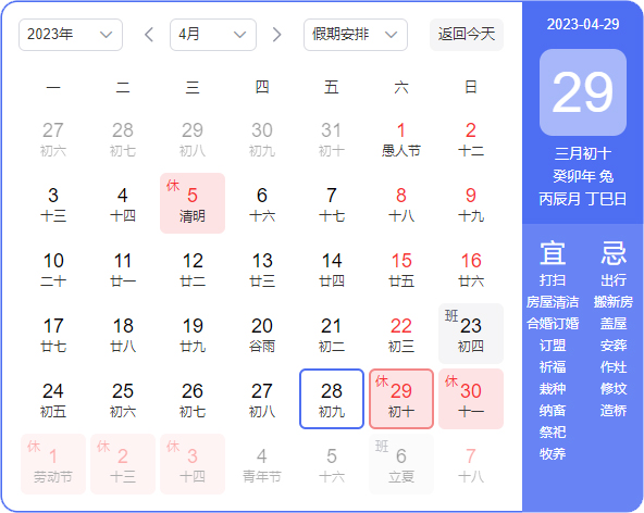放假时间:2023年5月1日(周六)——2023年5月4(周三),共5天。